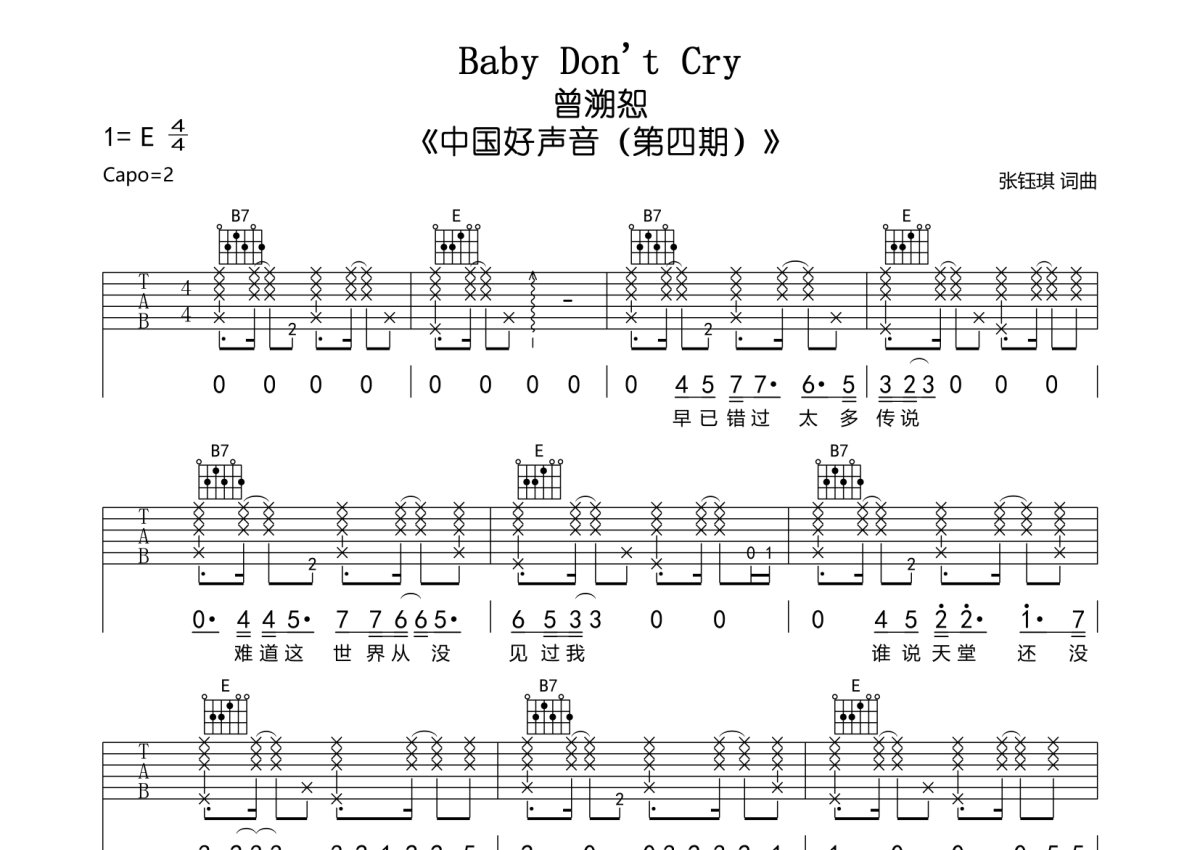 曾溯恕《Baby Don't Cry》吉他谱 - E调弹唱六线谱