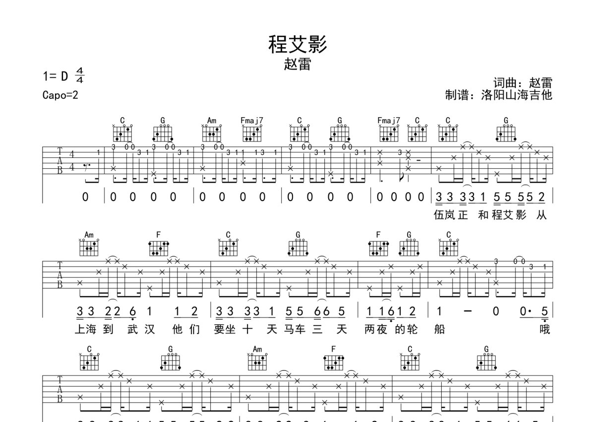 赵雷《程艾影》吉他谱 - C调弹唱六线谱