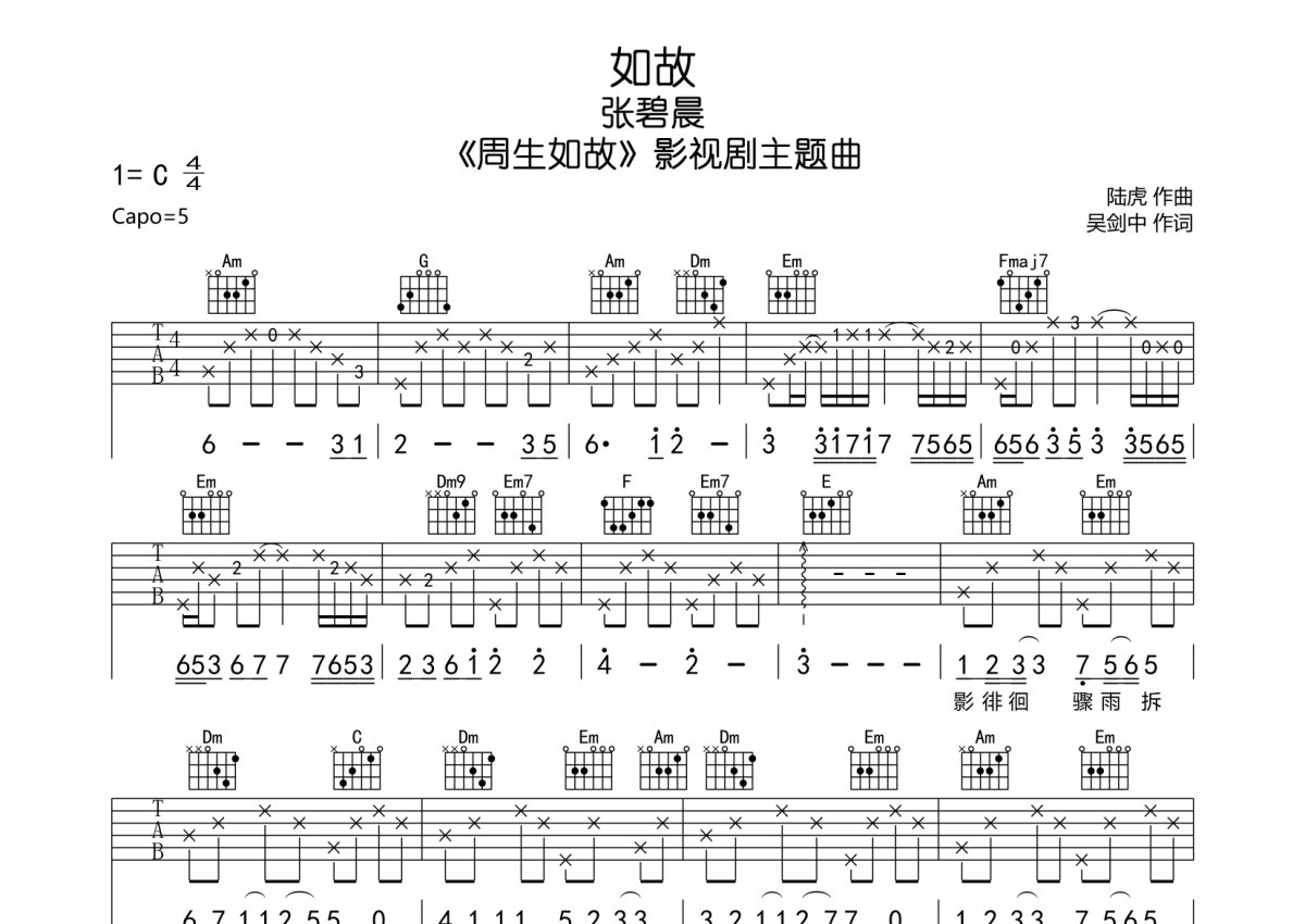 张碧晨《如故》吉他谱 - C调弹唱六线谱