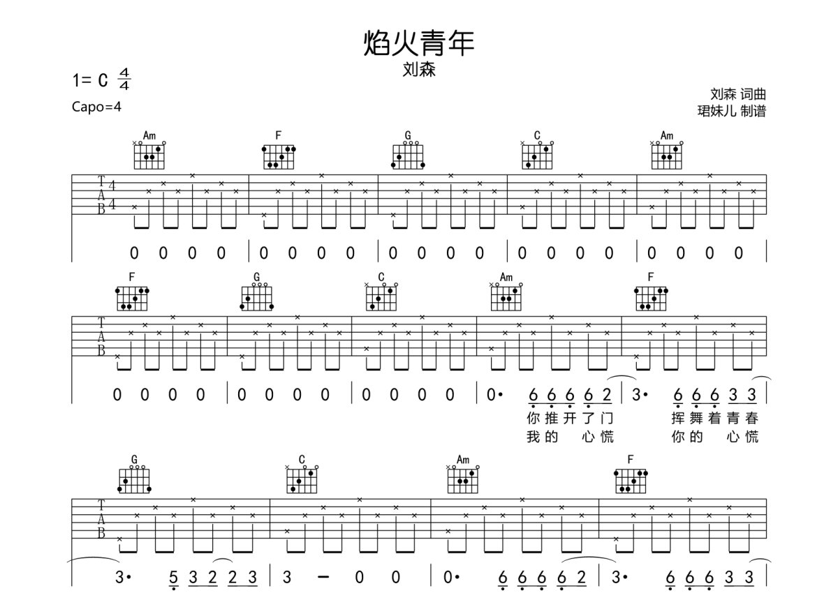 刘森《焰火青年》吉他谱 - C调弹唱六线谱