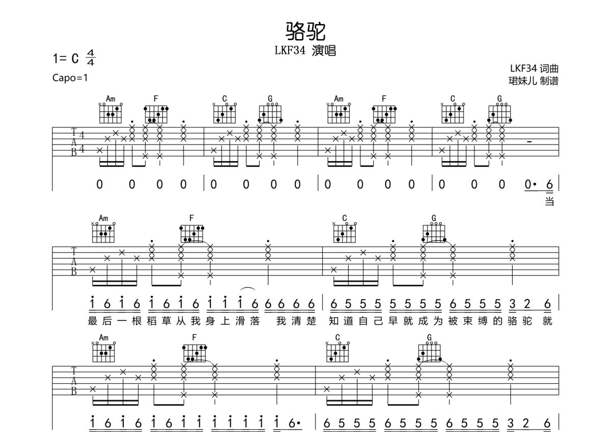 LKF34《骆驼》吉他谱 - C调弹唱六线谱