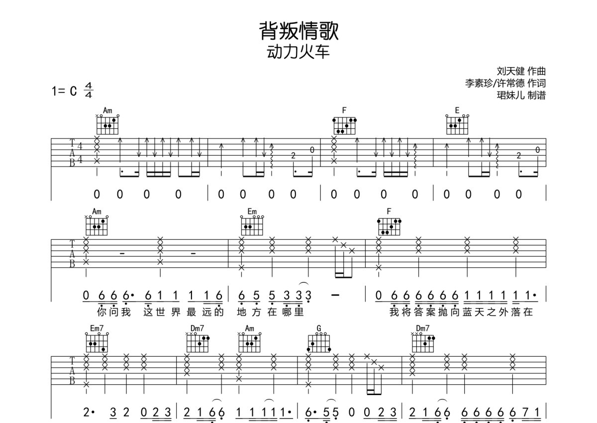 《背叛情歌》是动力火车演唱的一首歌曲,本吉他谱采用的是C调指法编配,这份吉他谱共有两张高清图谱,图谱由 @珺妹儿 编配上传,图谱使用六线谱编配,包含吉他和弦指法、简谱以及歌词部分,使用这份背叛情歌吉他谱,可以让你更加方便地掌握这首歌曲的弹唱技巧,快来尝试吧。动力火车《背叛情歌》吉他谱_C调吉他弹唱谱。