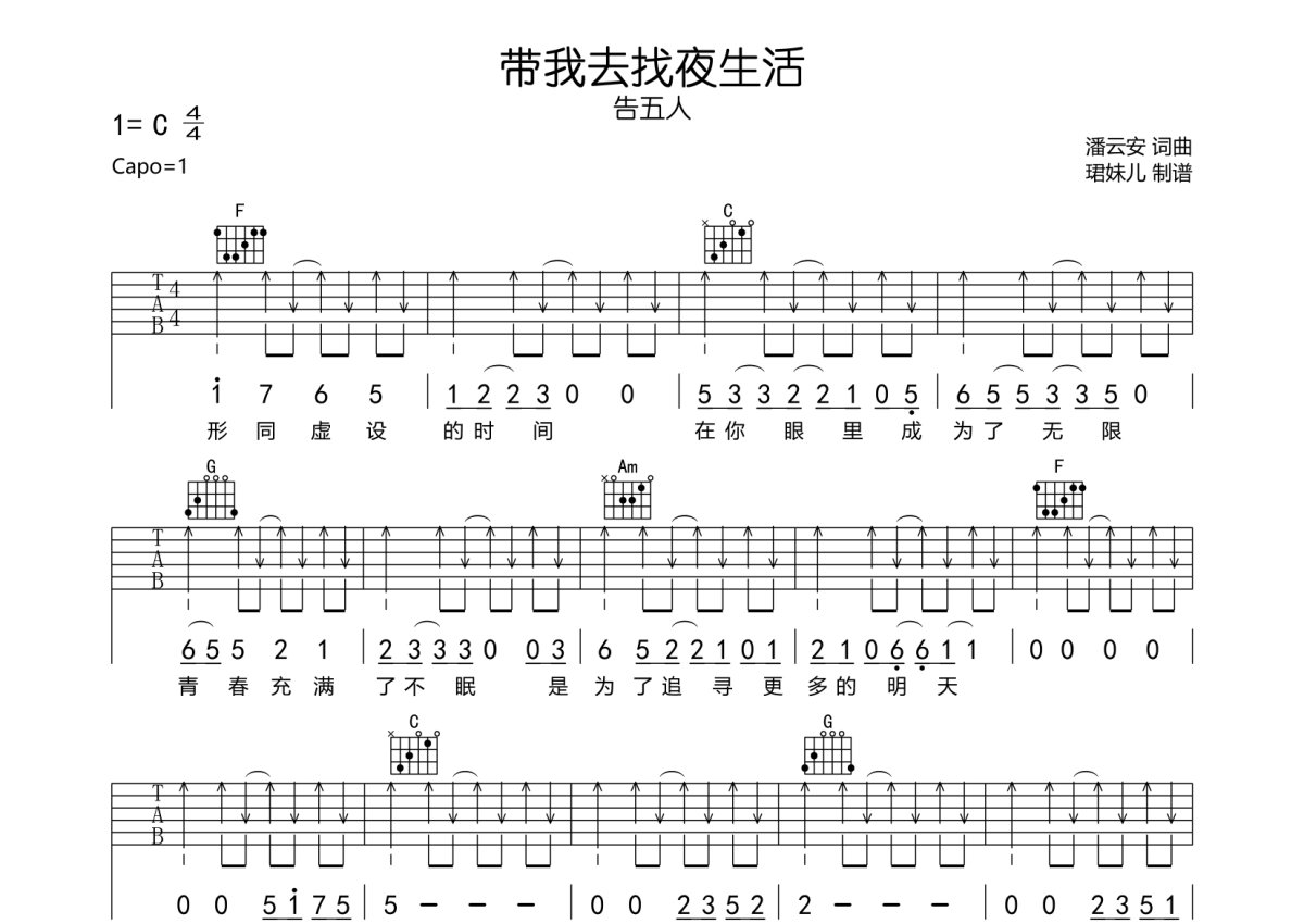 告五人《带我去找夜生活》吉他谱 - C调弹唱六线谱