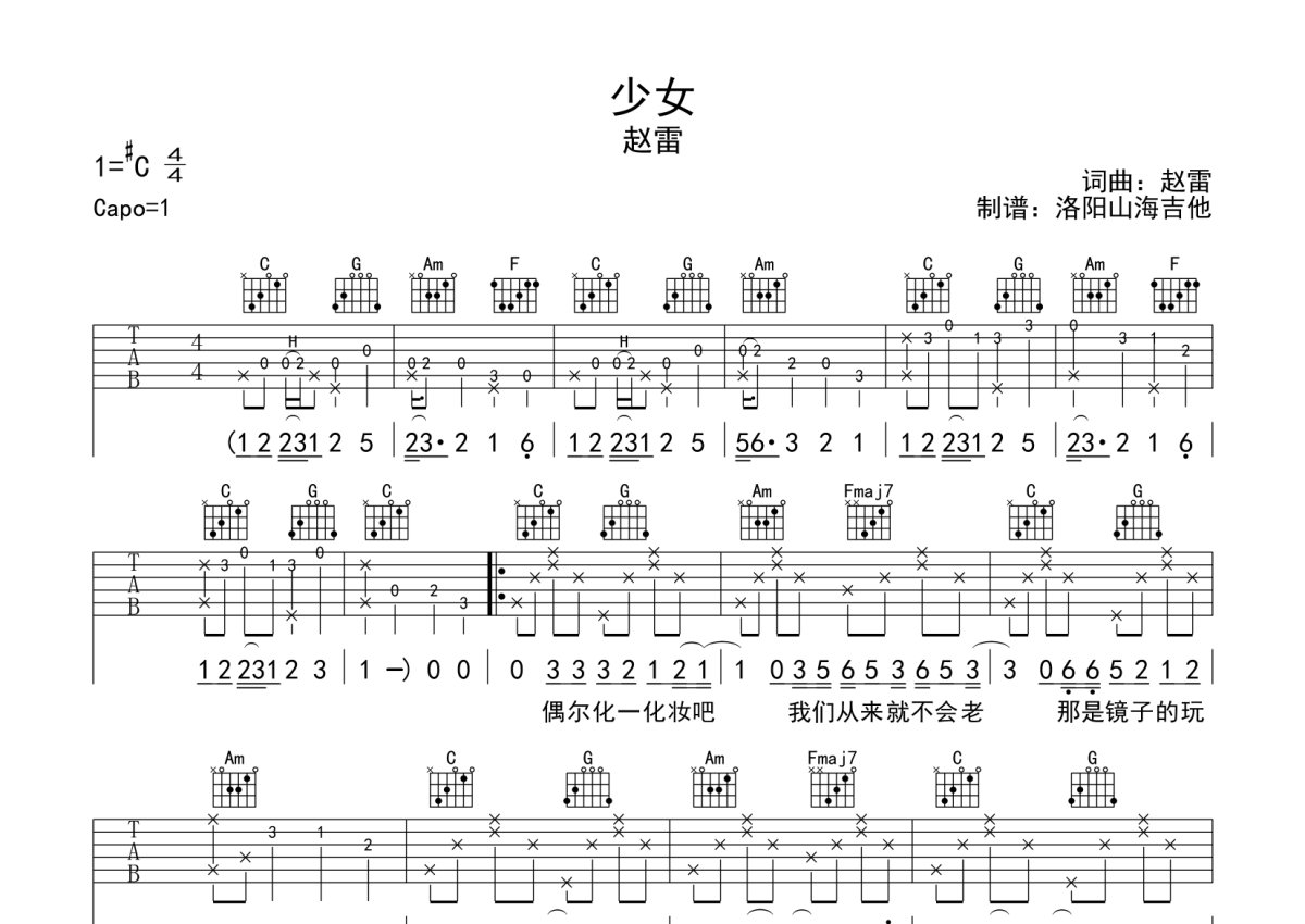 赵雷《少女》吉他谱 - C调弹唱六线谱