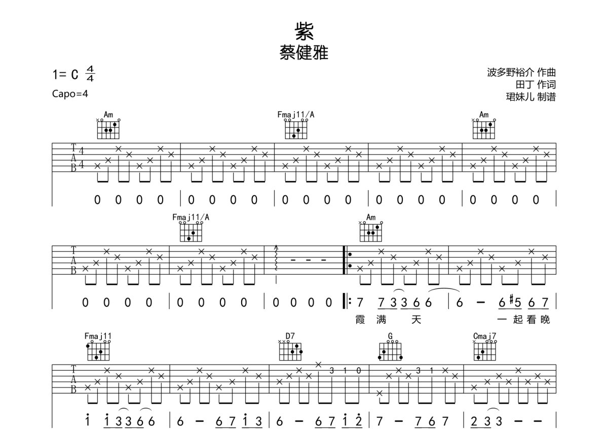 《紫》是蔡健雅演唱的一首歌曲,本吉他谱采用的是C调指法编配,这份吉他谱共有两张高清图谱,图谱由 @珺妹儿 编配上传,图谱使用六线谱编配,包含吉他和弦指法、简谱以及歌词部分,使用这份紫吉他谱,可以让你更加方便地掌握这首歌曲的弹唱技巧,快来尝试吧。蔡健雅《紫》吉他谱_C调吉他弹唱谱。
