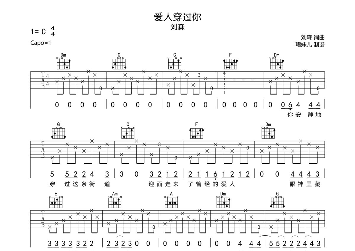 刘森《爱人穿过你》吉他谱 - C调弹唱六线谱