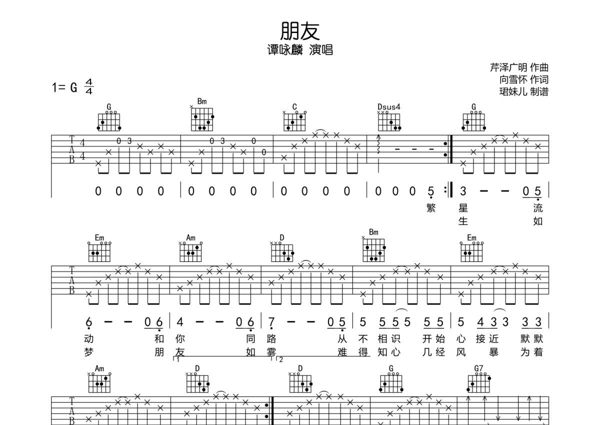 谭咏麟《朋友》吉他谱 - G调弹唱六线谱
