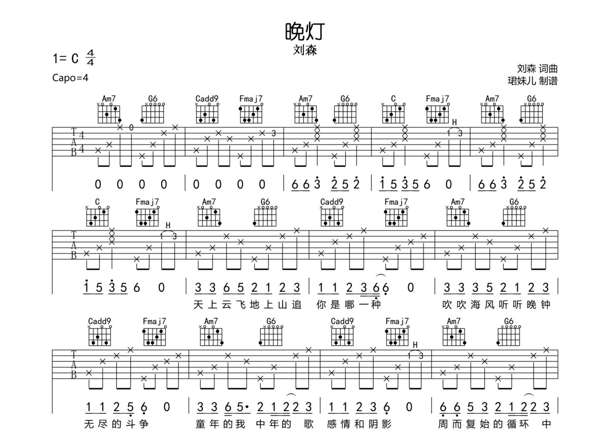 刘森《晚灯》吉他谱 - C调弹唱六线谱
