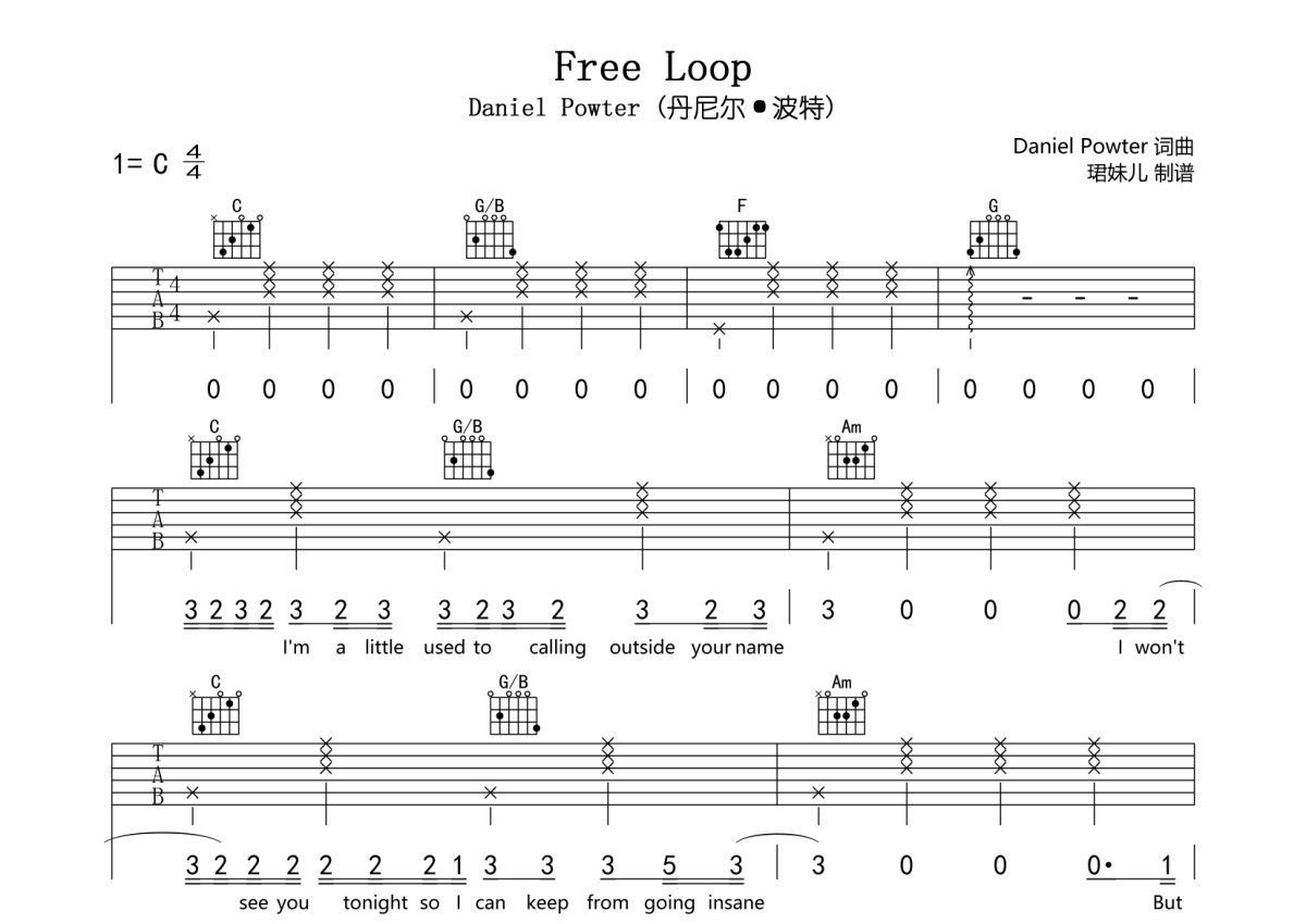 Daniel Powter《Free Loop》吉他谱 - C调弹唱六线谱