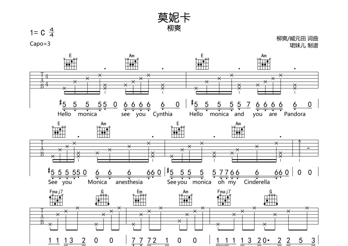 柳爽《莫妮卡》吉他谱 - C调弹唱六线谱