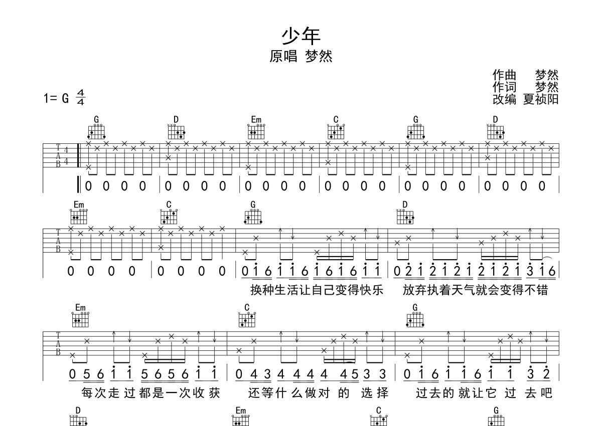 梦然《少年》吉他谱 - G调弹唱六线谱