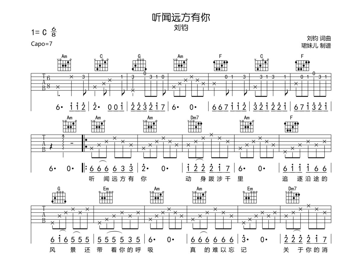刘钧《听闻远方有你》吉他谱 - C调弹唱六线谱