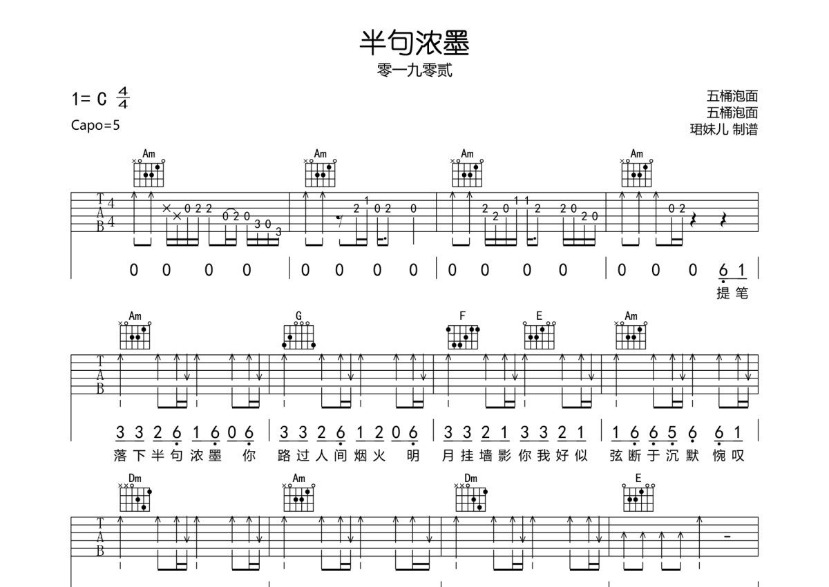 零一九零贰《半句浓墨》吉他谱 - C调弹唱六线谱