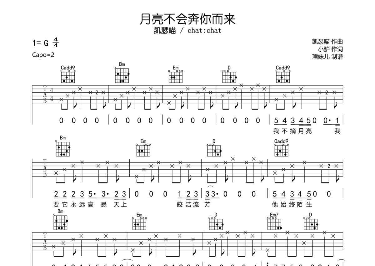 凯瑟喵 / chat:chat《月亮不会奔你而来》吉他谱 - G调弹唱六线谱
