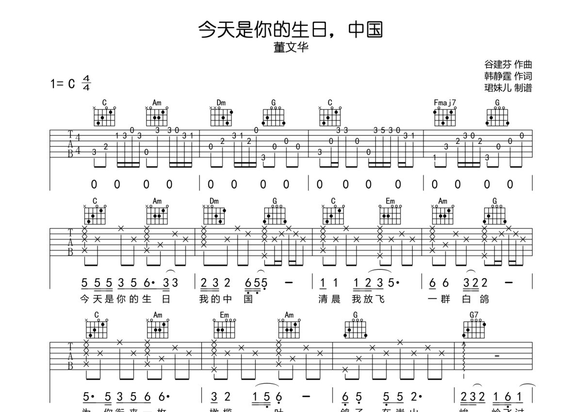 董文华《今天是你的生日,中国》吉他谱 - C调弹唱六线谱