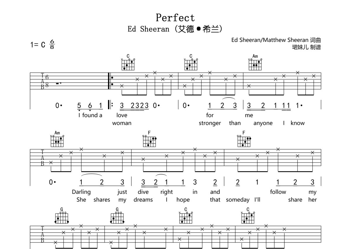 《Perfect》是Ed Sheeran演唱的一首歌曲,本吉他谱采用的是C调指法编配,这份吉他谱共有四张高清图谱,图谱由 @珺妹儿 编配上传,图谱使用六线谱编配,包含吉他和弦指法、简谱以及歌词部分,使用这份Perfect吉他谱,可以让你更加方便地掌握这首歌曲的弹唱技巧,快来尝试吧。Ed Sheeran《Perfect》吉他谱_C调吉他弹唱谱。