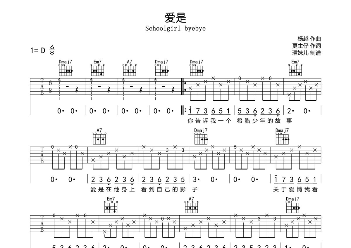 Schoolgirl byebye《爱是》吉他谱 - D调弹唱六线谱