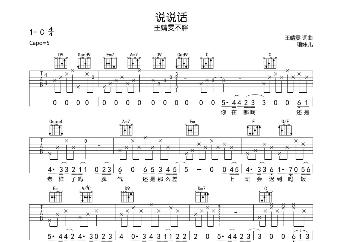 王靖雯不胖《说说话》吉他谱 - C调弹唱六线谱