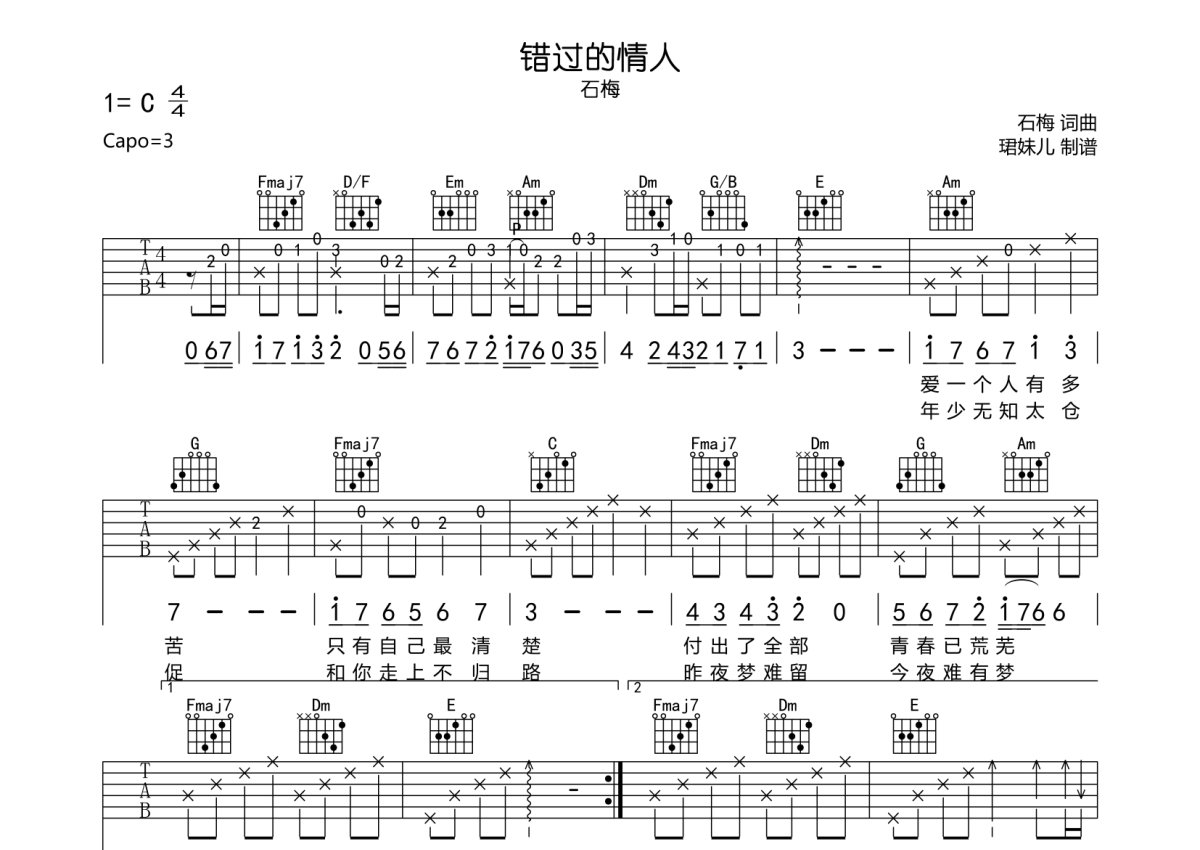石梅《错过的情人》吉他谱 - C调弹唱六线谱