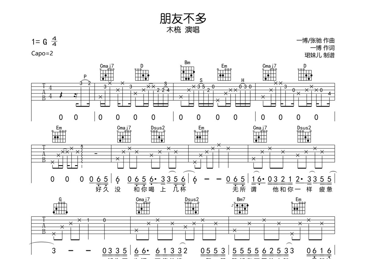 木梳《朋友不多》吉他谱 - G调弹唱六线谱