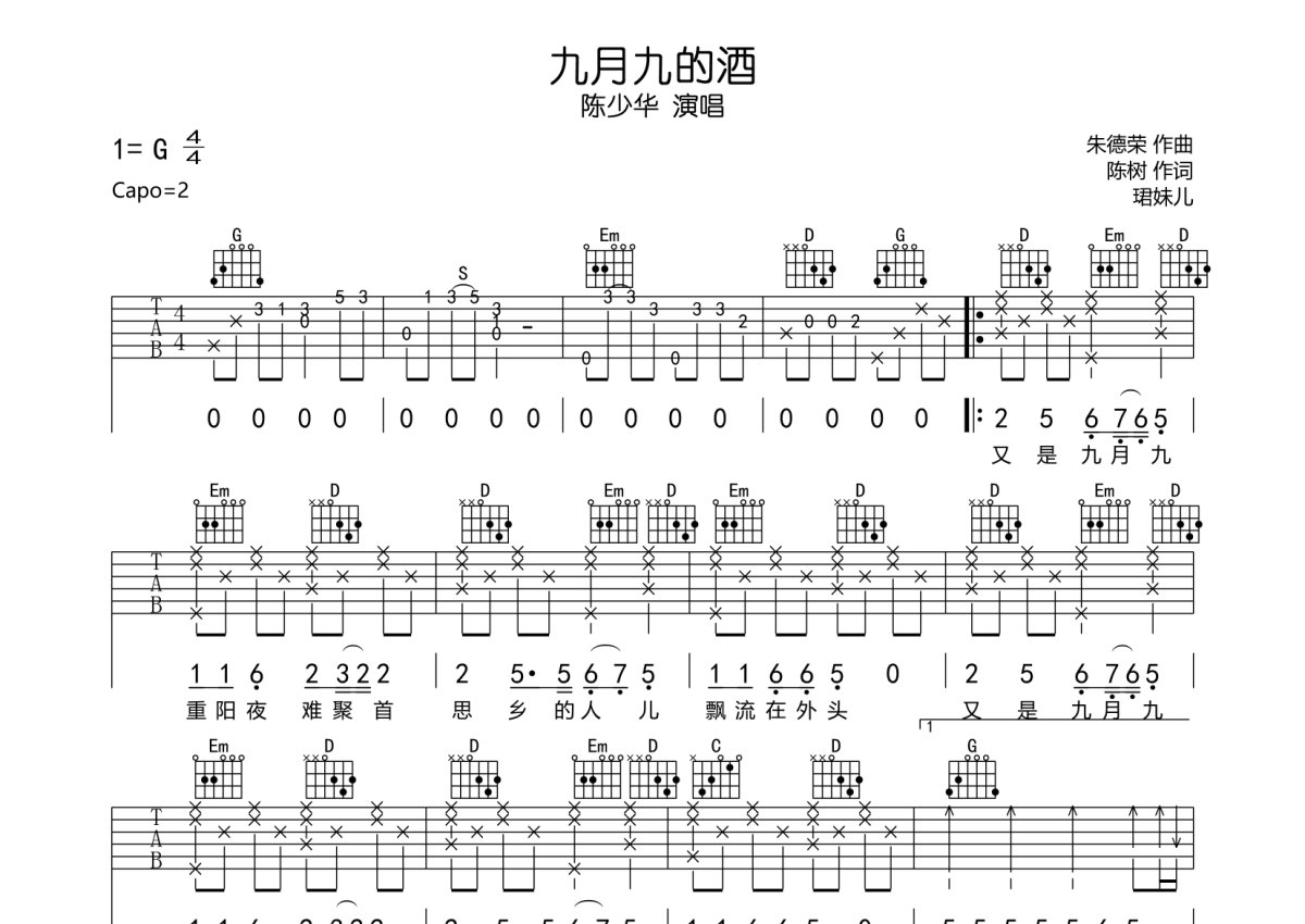 陈少华《九月九的酒》吉他谱 - G调弹唱六线谱