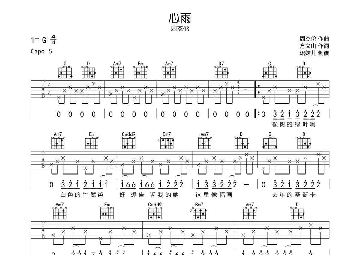 周杰伦《心雨》吉他谱 - G调弹唱六线谱