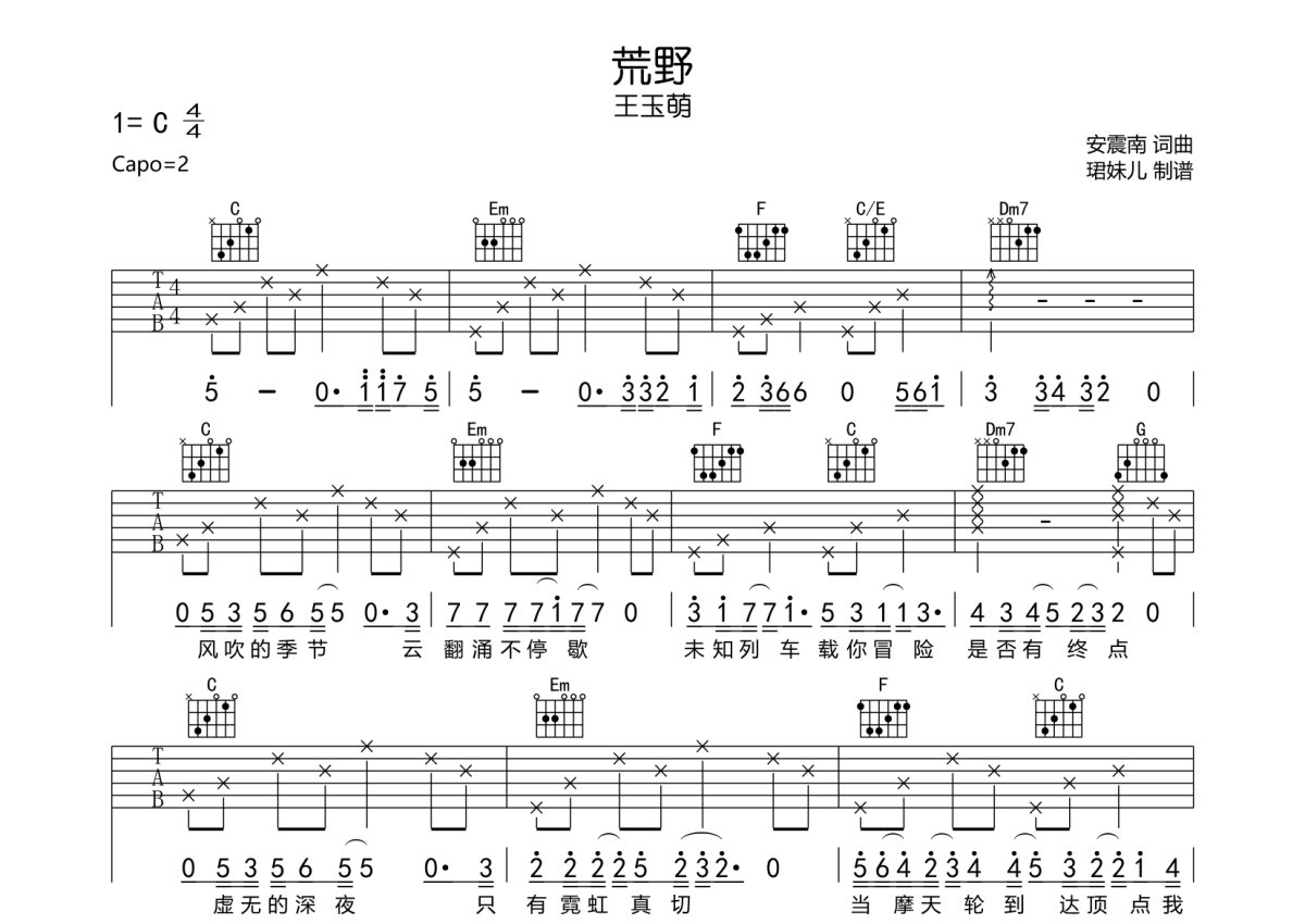 王玉萌《荒野》吉他谱 - C调弹唱六线谱