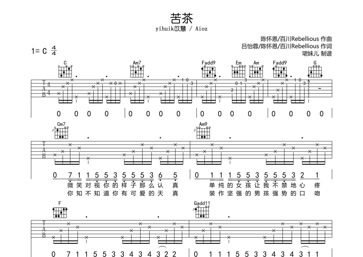 yihuik苡慧 / Aioz《苦茶》吉他谱 - C调弹唱六线谱