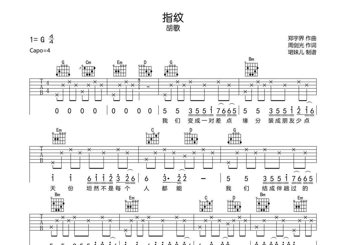 《指纹》是胡歌演唱的一首歌曲,本吉他谱采用的是G调指法编配,这份吉他谱共有三张高清图谱,图谱由 @珺妹儿 编配上传,图谱使用六线谱编配,包含吉他和弦指法、简谱以及歌词部分,使用这份指纹吉他谱,可以让你更加方便地掌握这首歌曲的弹唱技巧,快来尝试吧。本谱采用G调指法编配,弹唱建议变调夹4品,难度较简单。