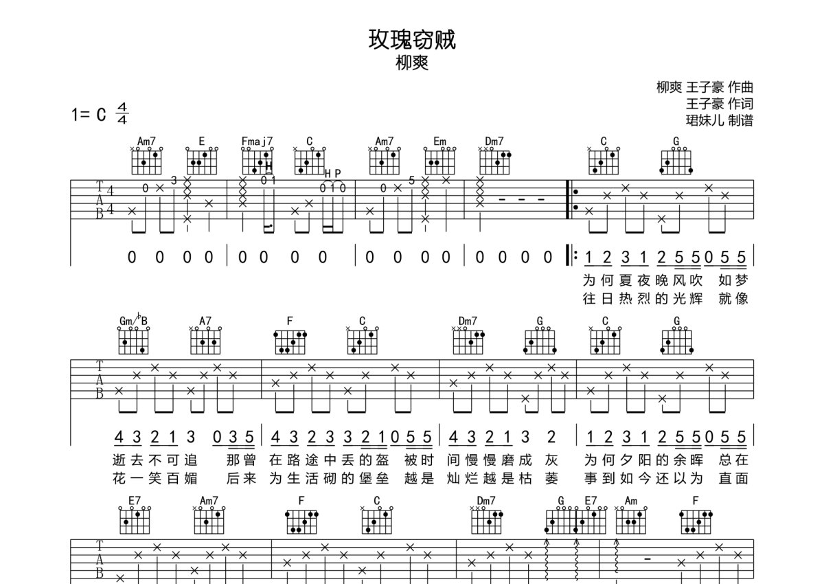 柳爽《玫瑰窃贼》吉他谱 - C调弹唱六线谱