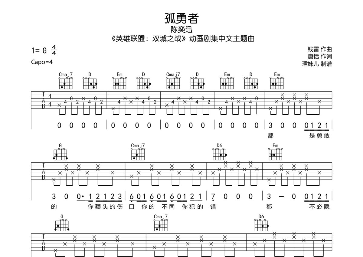 陈奕迅《孤勇者》吉他谱 - G调弹唱六线谱
