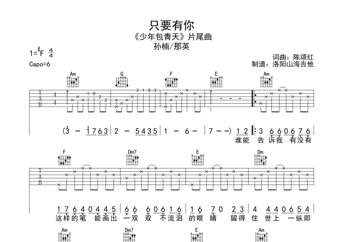 《只要有你》是那英/孙楠演唱的一首歌曲,本吉他谱采用的是C调指法编配,这份吉他谱共有两张高清图谱,图谱由 @何奔洋 编配上传,图谱使用六线谱编配,包含吉他和弦指法、简谱以及歌词部分,曲谱配备了相关的音频提供试听,使用这份只要有你吉他谱,可以让你更加方便地掌握这首歌曲的弹唱技巧,快来尝试吧。