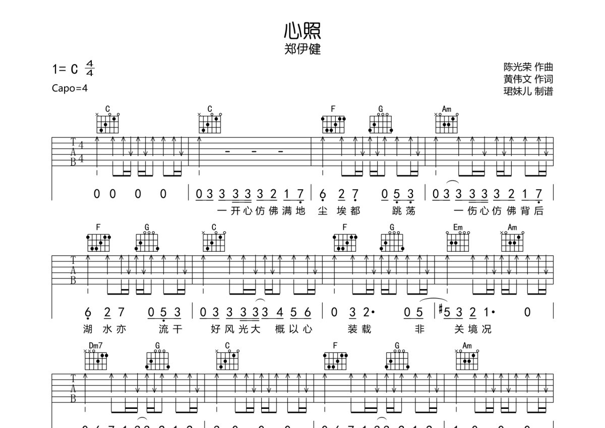 《心照》是郑伊健演唱的一首歌曲,本吉他谱采用的是C调指法编配,这份吉他谱共有三张高清图谱,图谱由 @珺妹儿 编配上传,图谱使用六线谱编配,包含吉他和弦指法、简谱以及歌词部分,使用这份心照吉他谱,可以让你更加方便地掌握这首歌曲的弹唱技巧,快来尝试吧。本谱采用C调指法编配,弹唱建议变调夹4品,速度90BPM,难度较简单。