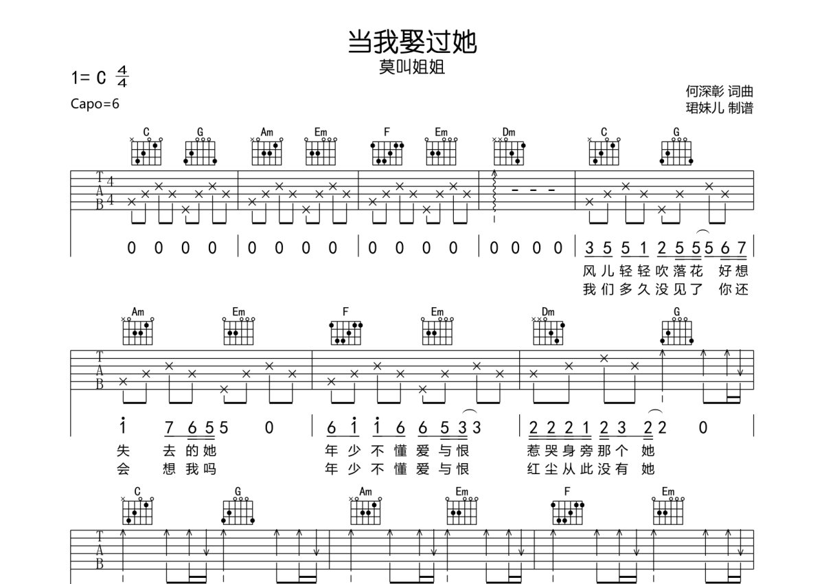 莫叫姐姐《当我娶过她》吉他谱 - C调弹唱六线谱