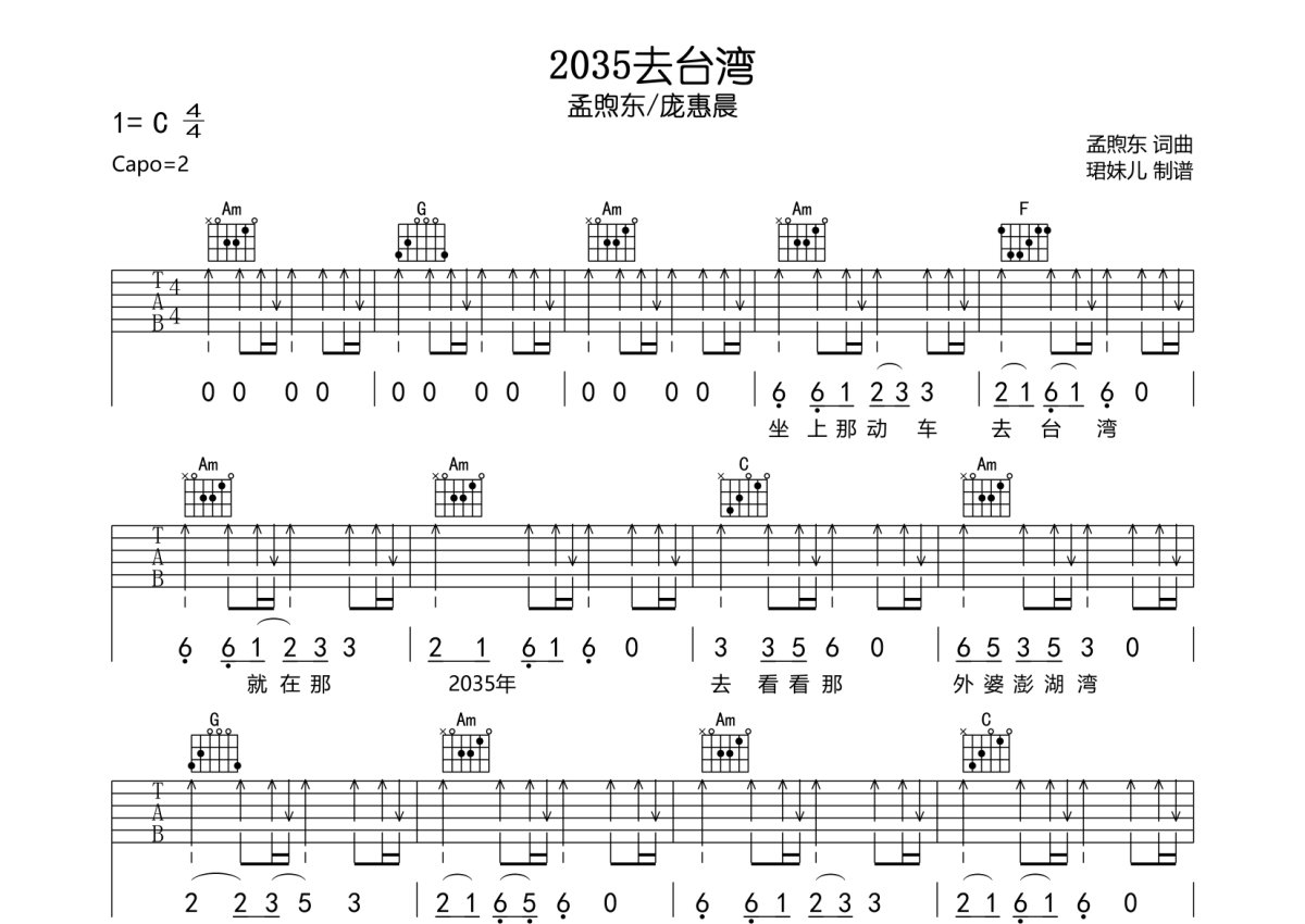 孟煦东/庞惠晨《2035去台湾》吉他谱 - C调弹唱六线谱