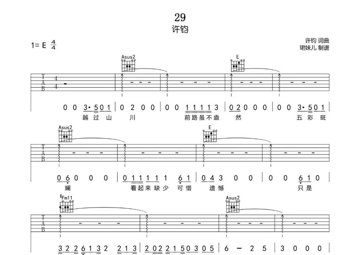 《29》是许钧演唱的一首歌曲,本吉他谱采用的是E调指法编配,这份吉他谱共有三张高清图谱,图谱由 @珺妹儿 编配上传,图谱使用六线谱编配,包含吉他和弦指法、简谱以及歌词部分,使用这份29吉他谱,可以让你更加方便地掌握这首歌曲的弹唱技巧,快来尝试吧。本谱采用E调指法编配,速度80BPM,难度较简单。