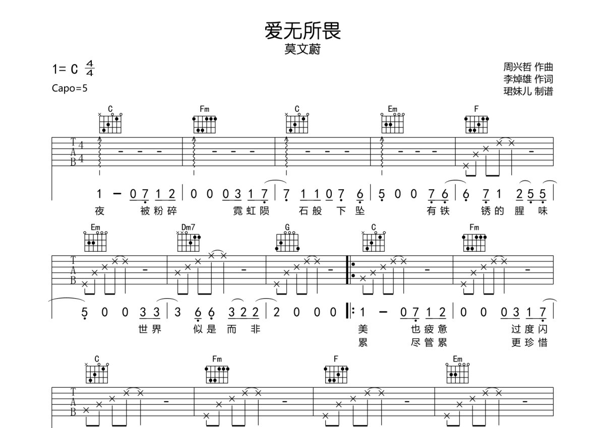 莫文蔚《爱无所畏》吉他谱 - C调弹唱六线谱