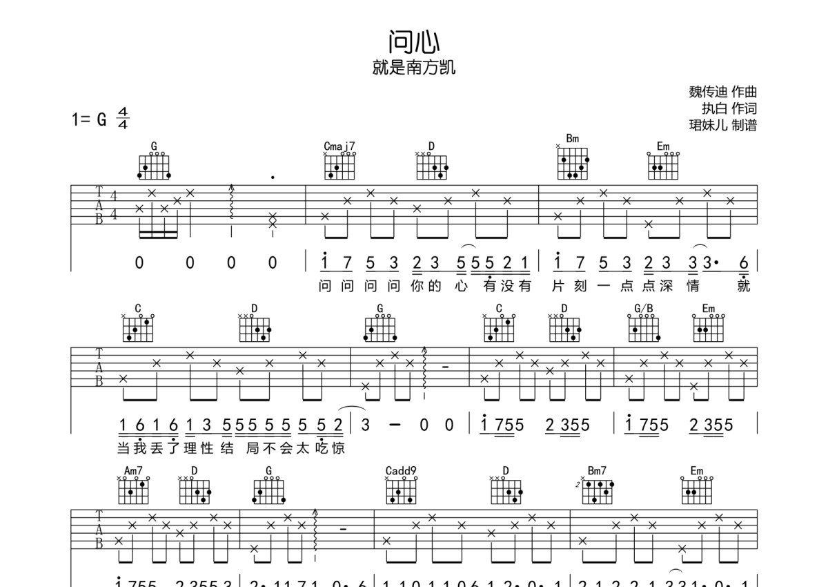 就是南方凯《问心》吉他谱 - G调弹唱六线谱