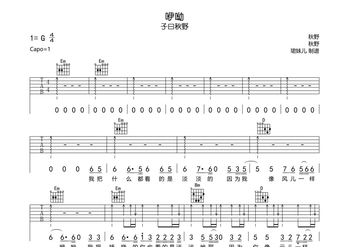 《咿呦》是子曰秋野演唱的一首歌曲,本吉他谱采用的是G调指法编配,这份吉他谱共有三张高清图谱,图谱由 @珺妹儿 编配上传,图谱使用六线谱编配,包含吉他和弦指法、简谱以及歌词部分,使用这份咿呦吉他谱,可以让你更加方便地掌握这首歌曲的弹唱技巧,快来尝试吧。本谱采用G调指法编配,弹唱建议变调夹1品,速度85BPM,难度较简单。