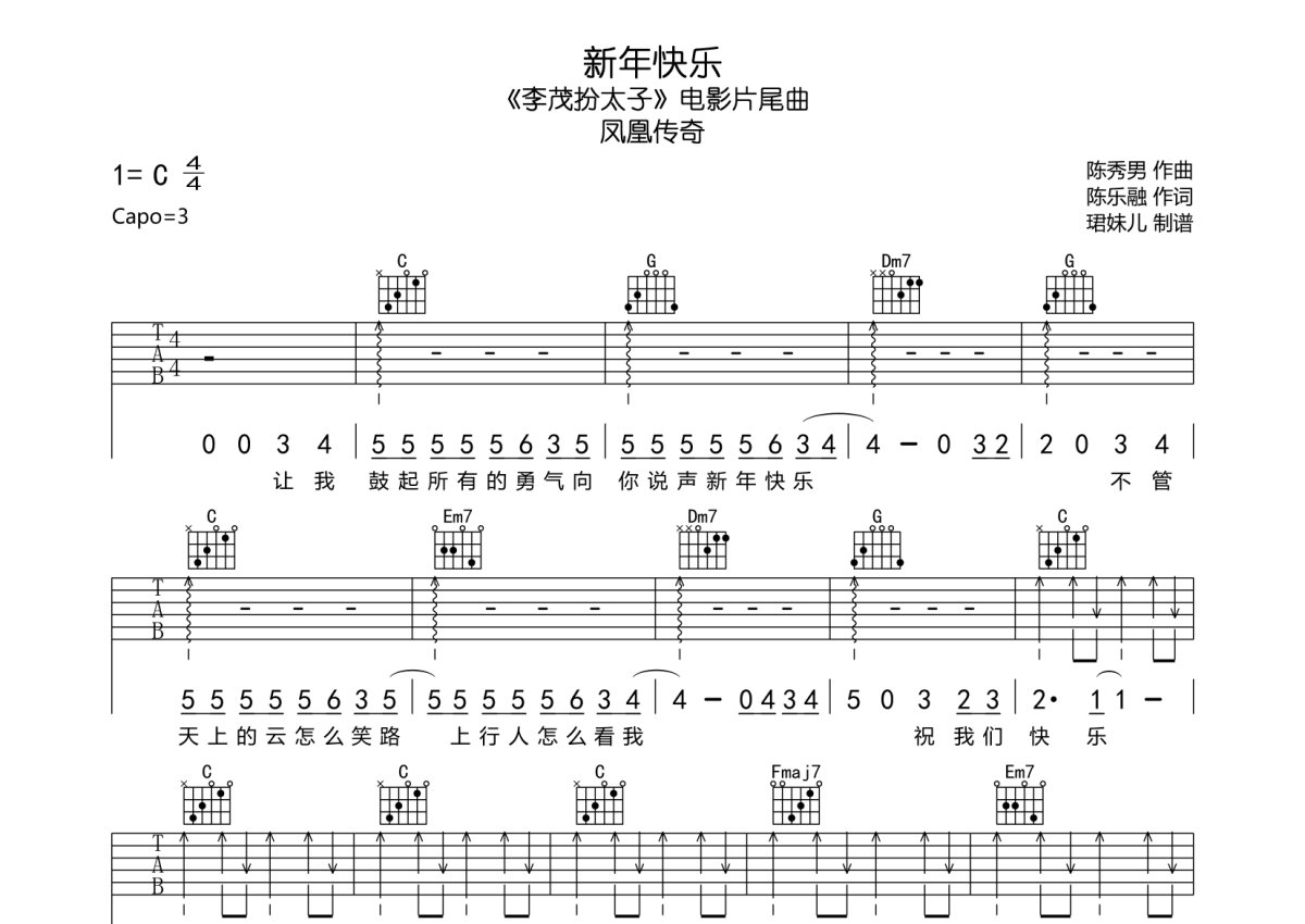 凤凰传奇《新年快乐》吉他谱 - C调弹唱六线谱