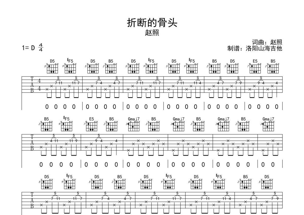 赵照《折断的骨头》吉他谱 - D调弹唱六线谱