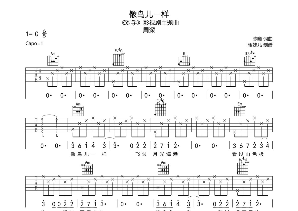 周深《像鸟儿一样》吉他谱 - C调弹唱六线谱