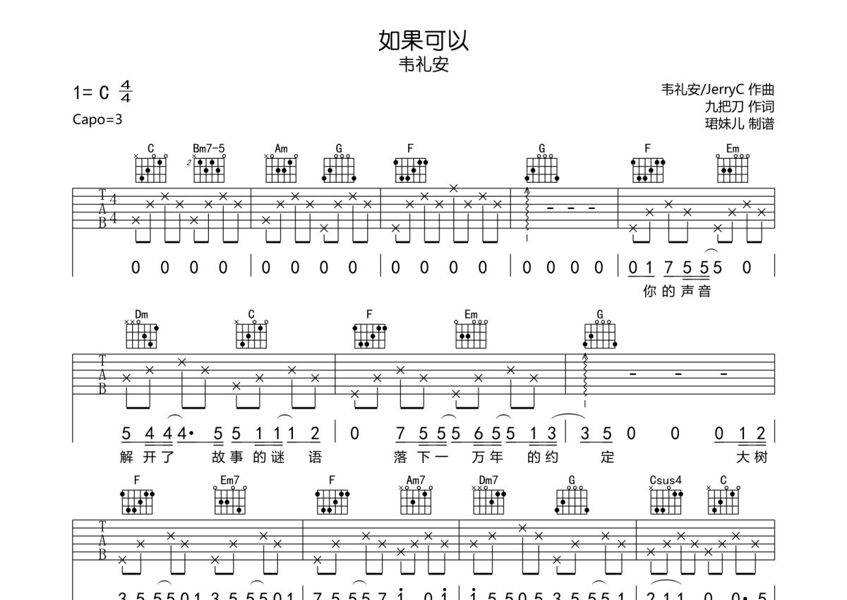 韦礼安《如果可以》吉他谱 - C调弹唱六线谱