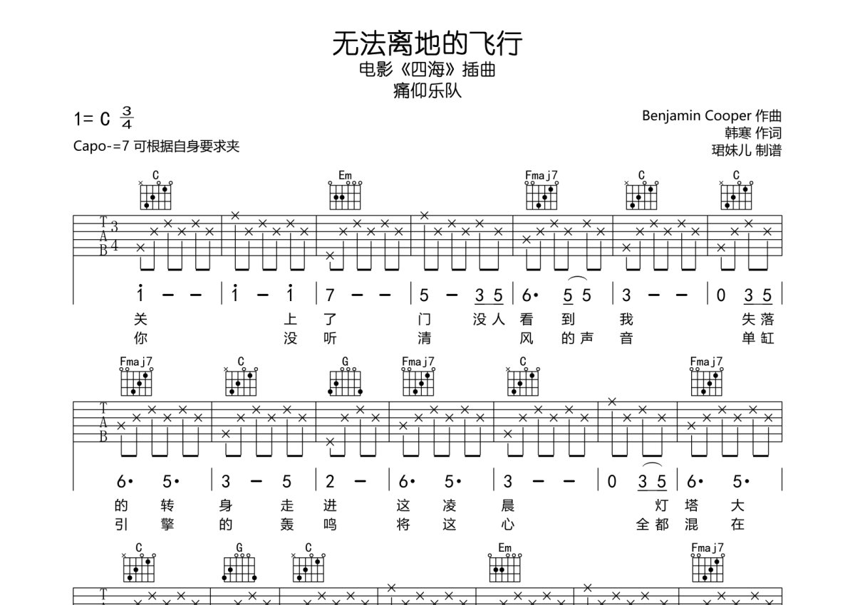 《无法离地的飞行》是痛仰乐队演唱的一首歌曲,本吉他谱采用的是C调指法编配,这份吉他谱共有三张高清图谱,图谱由 @珺妹儿 编配上传,图谱使用六线谱编配,包含吉他和弦指法、简谱以及歌词部分,使用这份无法离地的飞行吉他谱,可以让你更加方便地掌握这首歌曲的弹唱技巧,快来尝试吧。电影《四海》插曲,本谱采用C调指法编配,弹唱建议变调夹7品变回原调女生建议夹3品,速度90BPM,难度较简单,易上手。