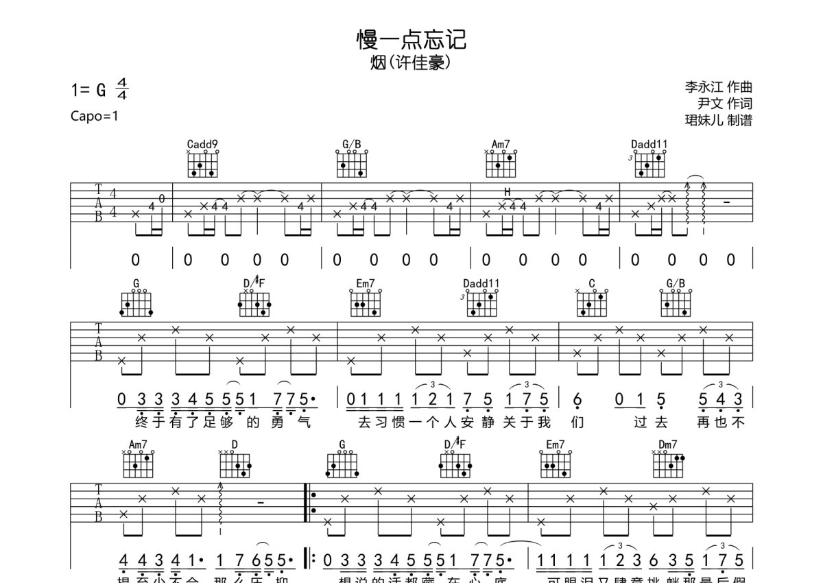 烟(许佳豪)《慢一点忘记》吉他谱 - G调弹唱六线谱