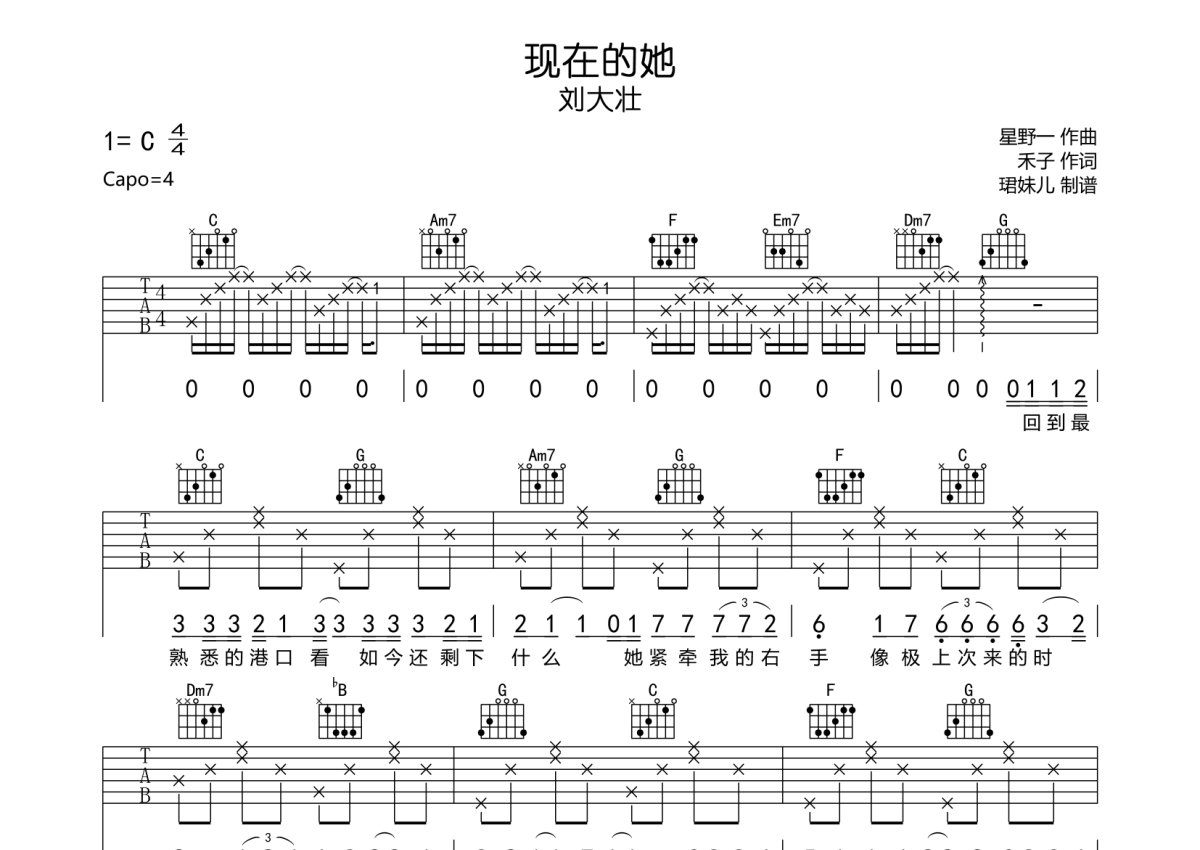 《现在的她》是刘大壮演唱的一首歌曲,正式版,本吉他谱采用的是C调指法编配,这份吉他谱共有两张高清图谱,图谱由 @珺妹儿 编配上传,图谱使用六线谱编配,包含吉他和弦指法、简谱以及歌词部分,使用这份现在的她吉他谱,可以让你更加方便地掌握这首歌曲的弹唱技巧,快来尝试吧。本谱采用C调指法编配,弹唱建议变调夹4品,速度85BPM,难度较简单,易上手。