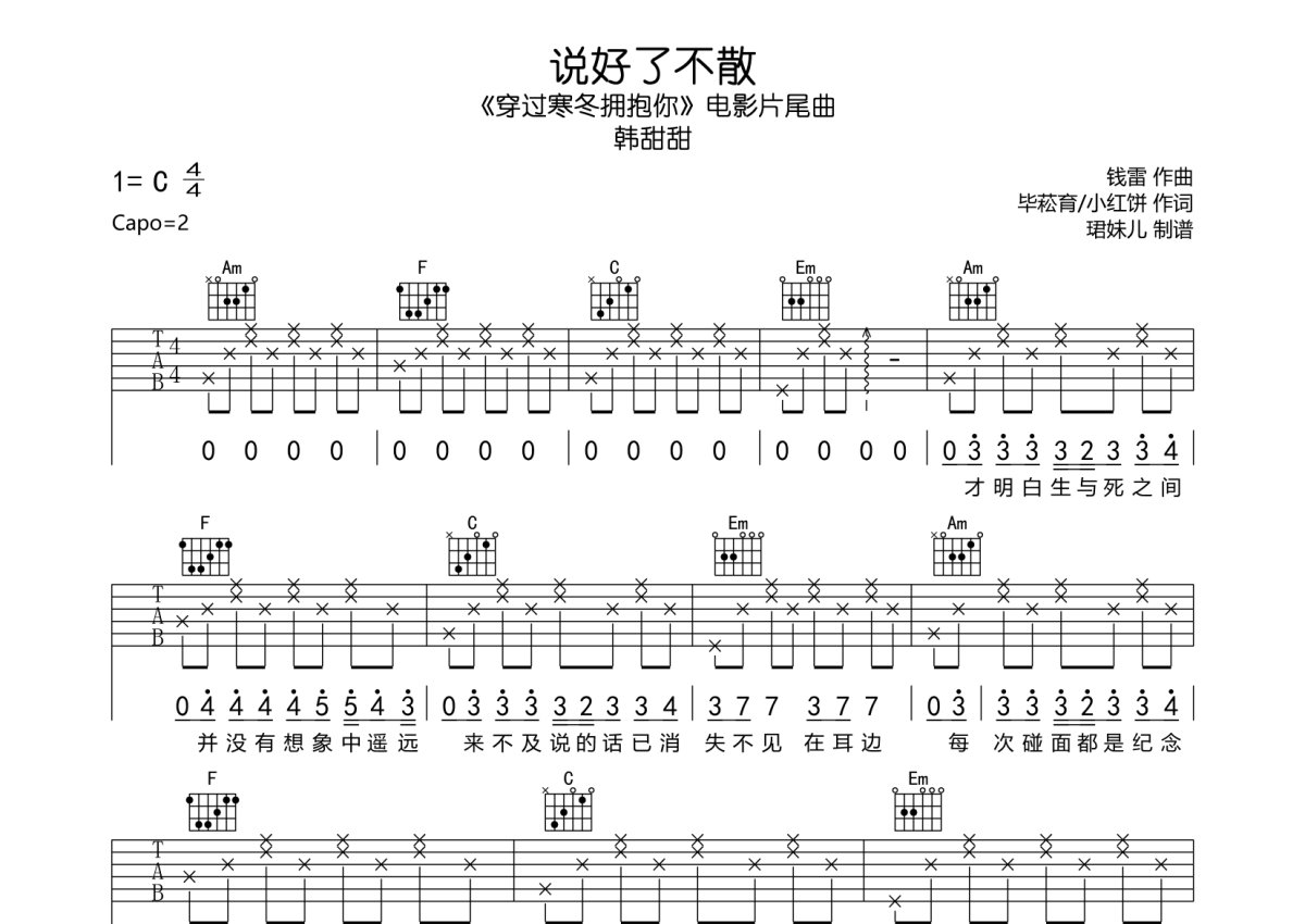 《说好了不散》是韩甜甜演唱的一首歌曲,本吉他谱采用的是C调指法编配,这份吉他谱共有三张高清图谱,图谱由 @珺妹儿 编配上传,图谱使用六线谱编配,包含吉他和弦指法、简谱以及歌词部分,使用这份说好了不散吉他谱,可以让你更加方便地掌握这首歌曲的弹唱技巧,快来尝试吧。《穿过寒冬拥抱你》电影片尾曲,本谱采用C调指法编配,弹唱建议变调夹2品,速度80BPM,难度较简单,易上手。