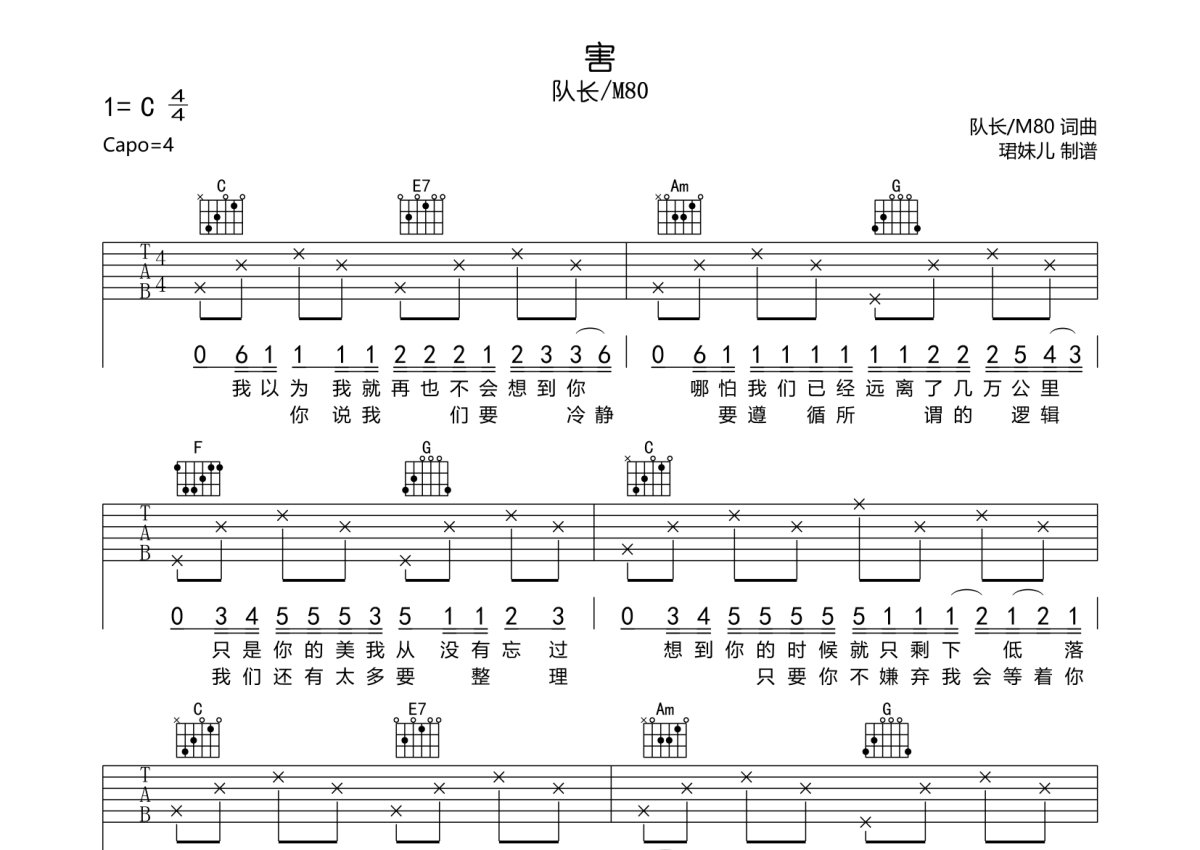 队长/M80《害》吉他谱 - C调弹唱六线谱