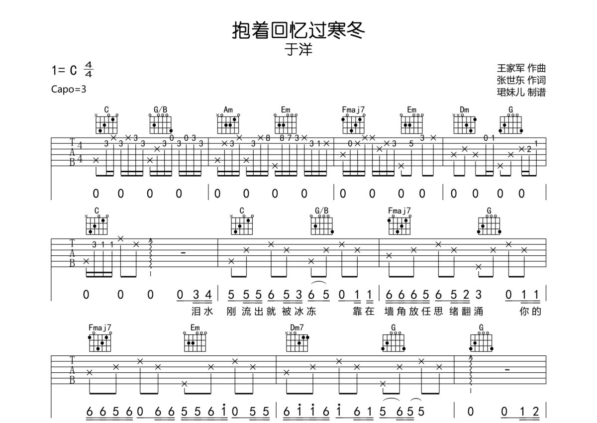 于洋《抱着回忆过寒冬》吉他谱 - C调弹唱六线谱
