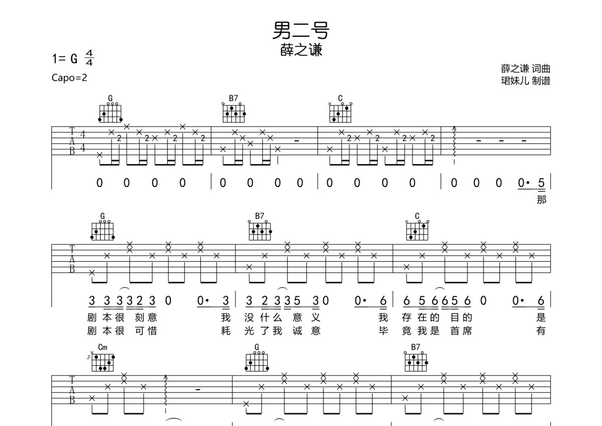 薛之谦《男二号》吉他谱 - G调弹唱六线谱